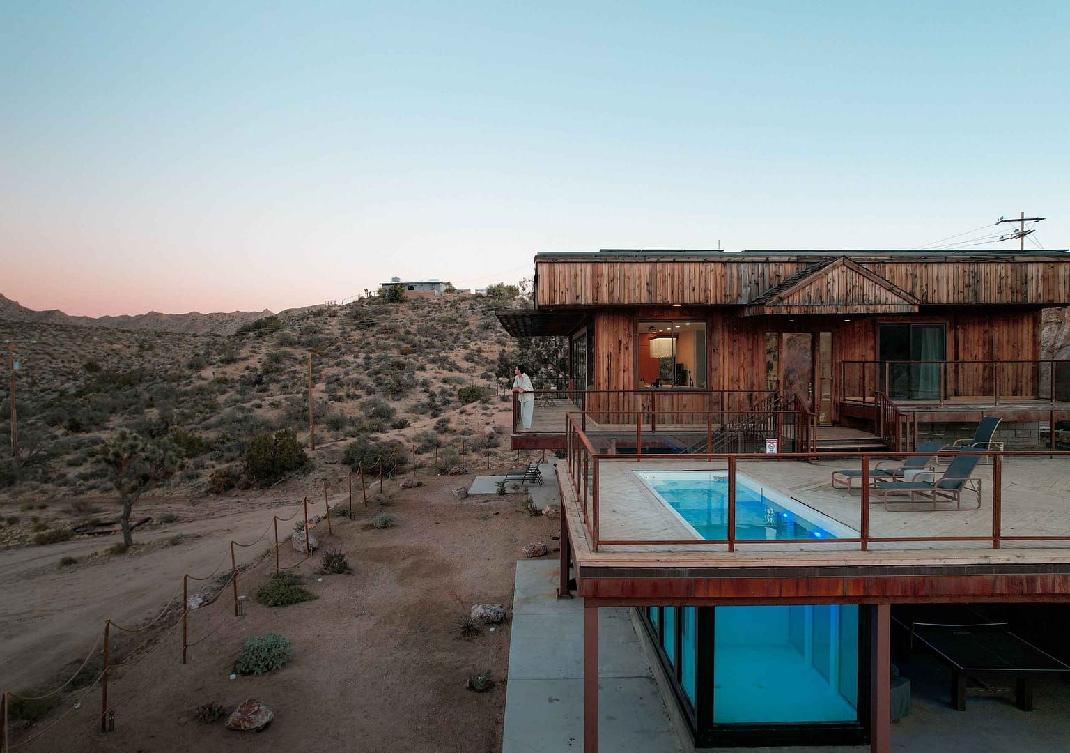 Immerse yourself in the serene desert landscape of Joshua Tree. Meditate on the yoga deck or relax under the stars in our unique glass container pool + Jacuzzi!